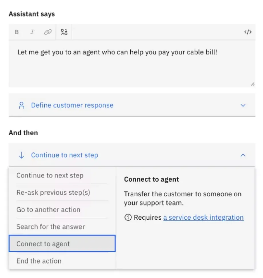 IBM Watson Assistant requires designing detailed decision trees for conversation flows (a legacy of the previous chatbot technology), which is time-consuming and requires expertise. In contrast, Quickchat AI automatically recognizes user intent , such as needing to transfer to a human agent, without the need for manual decision trees. This makes Quickchat AI simpler and more efficient to set up and manage, leveraging a true conversational AI engine.