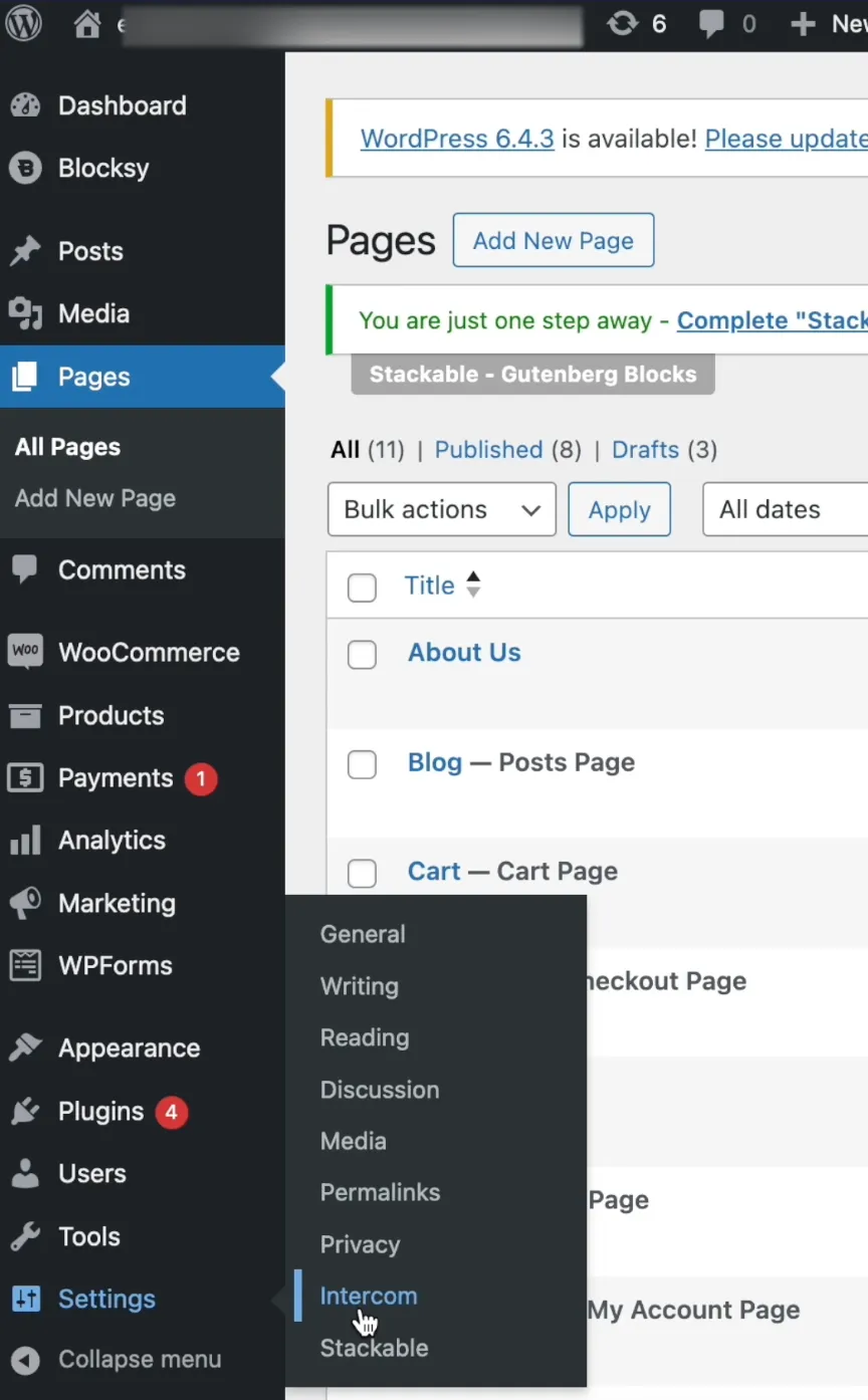 Alright, now I’m in WordPress — I’ve already downloaded the Intercom plugin to streamline to process of integrating Intercom into my website. If you don’t have it, just look for “Intercom” in the Plugins section and add it to WordPress.