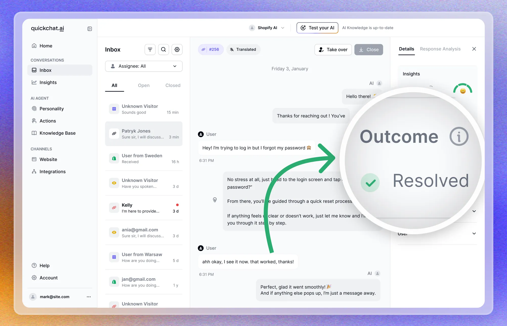 Conversation Outcome automatically tells you whether a chat ended with a Resolved or Unresolved outcome. No guesswork, no digging — just a quick, clear answer on how each conversation wraps up and whether it requires human attention.