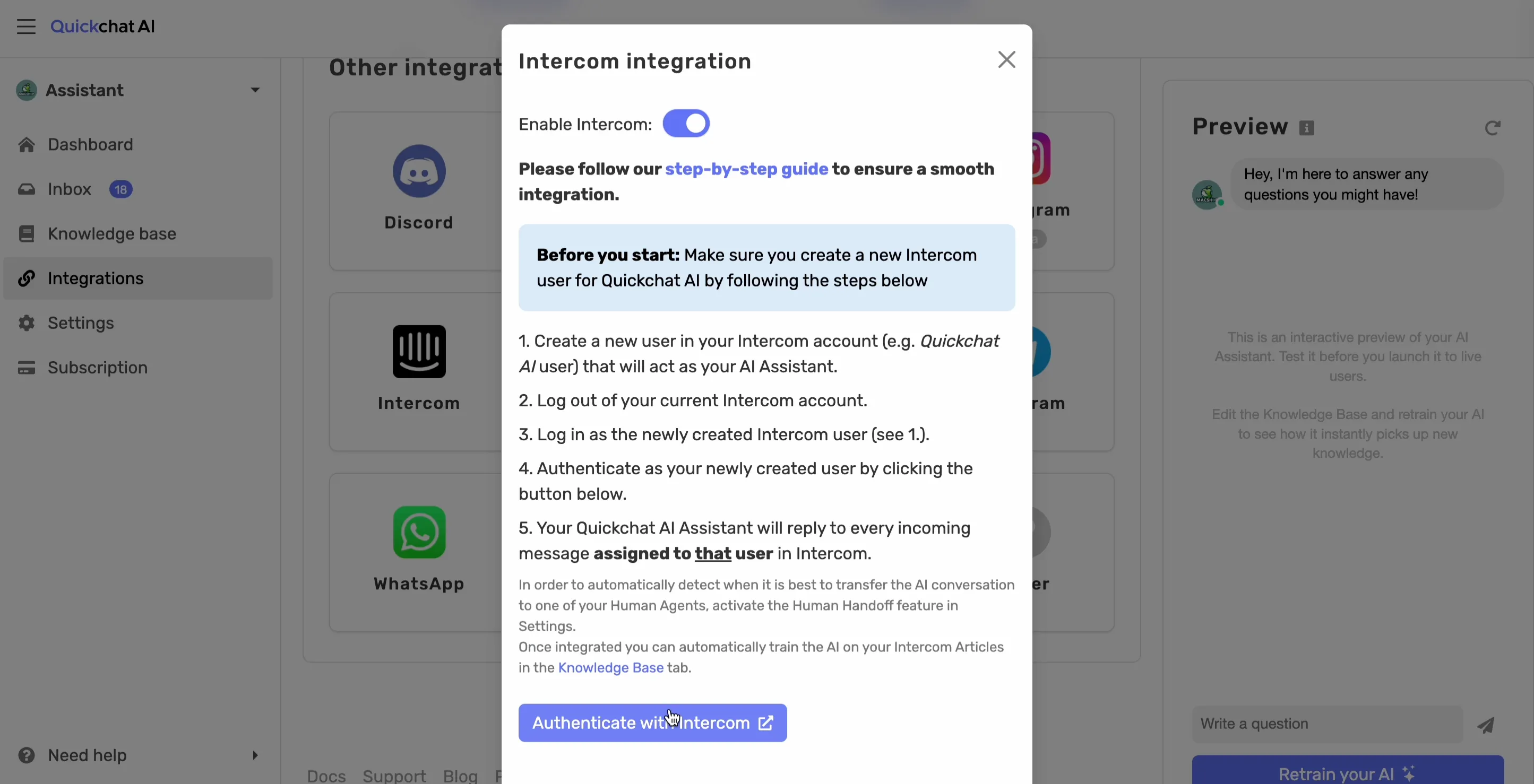 Let’s shortly recap how to integrate with Intercom and create an advanced AI Assistant: