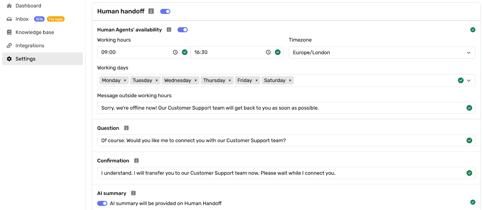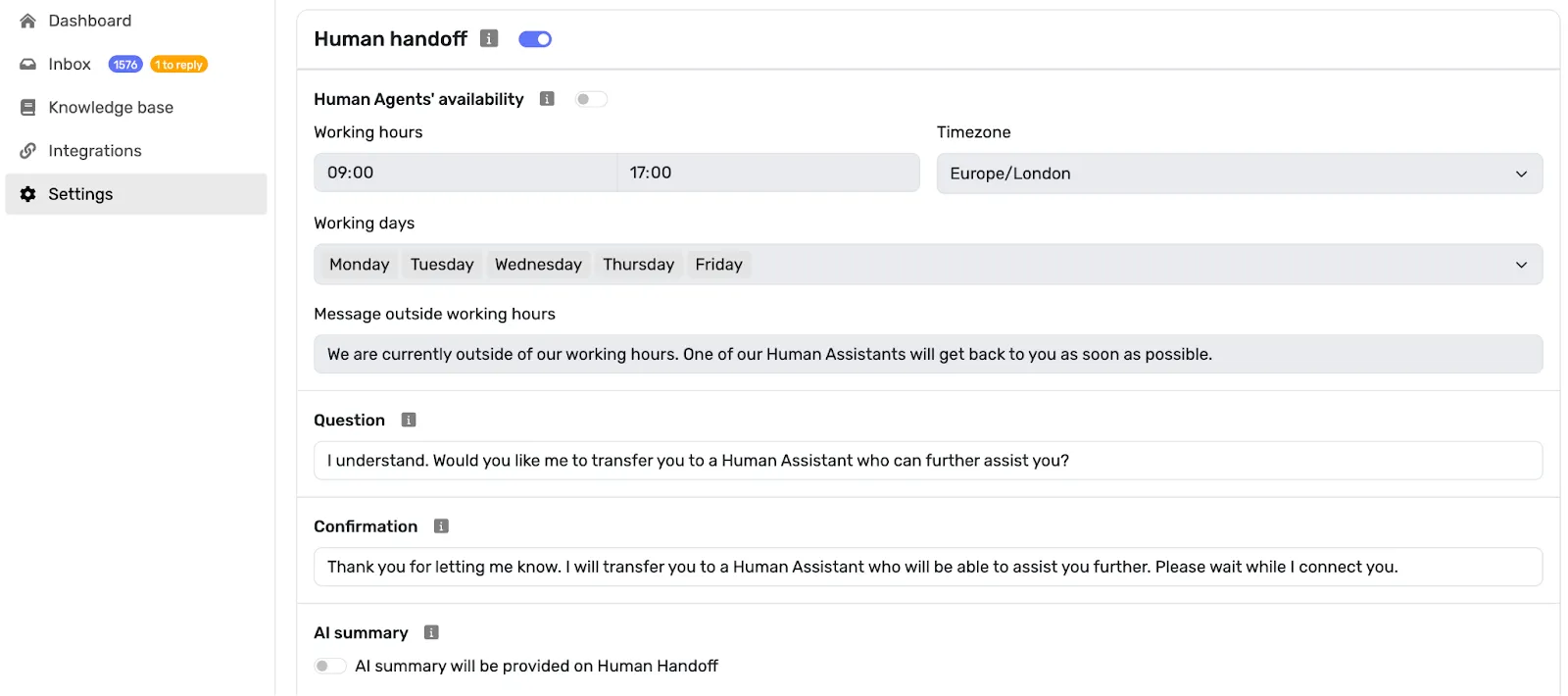 Human Handoff is a feature that automatically detects when the conversation should be handed off to a human agent and then transfers it to your team. This may include situations beyond your AI Agent’s capabilities, such as questions outside the Knowledge Base’s scope or when a customer specifically requests to be connected with your customer support team.